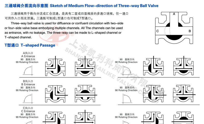 氣動(dòng)三通球閥分L型和T型,介質(zhì)流通方向見(jiàn)下圖。L型氣動(dòng)三通球閥適用于介質(zhì)流向的切換,能使相互垂直的兩個(gè)通道連通:T型氣動(dòng)三通球閥適用于介質(zhì)的分流、合流或流向 切換,T型孔道可以使三個(gè)通道互相連通或使其中兩個(gè)通道連通,氣動(dòng)三通球閥一般采用三個(gè)閥座結(jié)構(gòu),亦可根據(jù)用戶要求采用四閥座結(jié)構(gòu)。