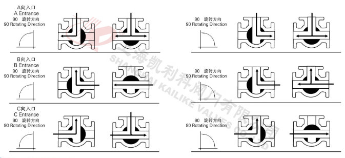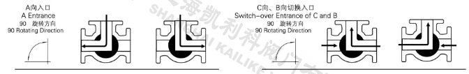 電動(dòng)三通球閥分L型和T型,介質(zhì)流通方向見下圖。L型電動(dòng)三通球閥適用于介質(zhì)流向的切換,能使相互垂直的兩個(gè)通道連通:T型電動(dòng)三通球閥適用于介質(zhì)的分流、合流或流向 切換,T型孔道可以使三個(gè)通道互相連通或使其中兩個(gè)通道連通,電動(dòng)三通球閥一般采用三個(gè)閥座結(jié)構(gòu),亦可根據(jù)用戶要求采用四閥座結(jié)構(gòu)。