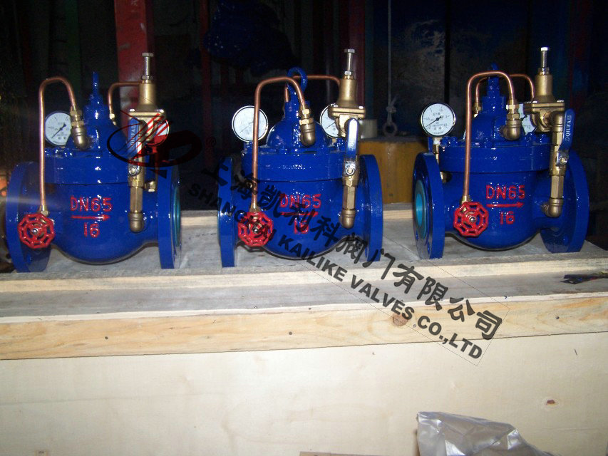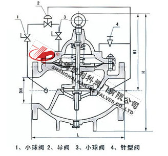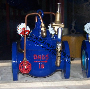 900X緊急關閉閥當出口壓力低于導閥設定的壓力時,導閥此時處于開通狀態(tài),主閥上腔壓力與主閥出口壓力相等,進口與吃口存在壓差,水流經閥口出口流出,當消防泵氣泵時,或變平泵壓力升高時,超過導閥設定壓力,由主閥進口向導閥管控制室壓力升高,作用在彈簧壓力增大,向下壓緊,帶動閥芯下移,使導閥關閉,此時主閥進口壓力通過節(jié)流閥補充到主閥閥蓋上腔,因閥瓣受到向下壓力大于向上推力,主閥關閉。值得注意的是,進口壓力小于設定壓力是,主閥處于開啟狀態(tài),進口壓力大于設定壓力,閥瓣關閉。